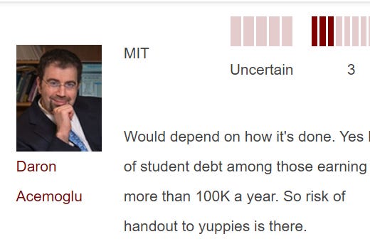 Sigh. The IGM Economic Experts polls are NOT where I go to get an expert opinion on a topic. Why? In any given poll, only a handful of the panel members are subject-matter on the issue. I honestly don’t care what some think about student loan forgiveness. AND the questions are usually poorly written.