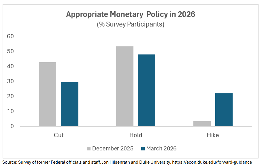 In the survey of former Fed officials and staff, the hawkish shift is clear. At the end of last year, less than 5% of participants thought a hike in interest rates would be appropriate in 2026; now, more than 20% see a hike as appropriate. The percent who view a cut in 2026 as appropriate dropped from 40% to 30% across the two surveys.