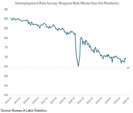The response rate to the survey used to estimate unemployment is now lower than during the pandemic (see chart). Participation had been drifting down for years, but the decline over the past year was the steepest outside the pandemic period.