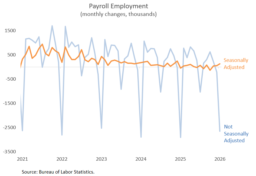 The observation is correct. Every year in January, payrolls fall sharply as temporary holiday workers are let go. In January 2026, payroll employment declined by 2.6 million on a not seasonally adjusted basis (blue line below). But that decline was smaller than a typical January. After seasonal adjustment, payrolls increased by 130,000 (orange line)—the figure most often reported.